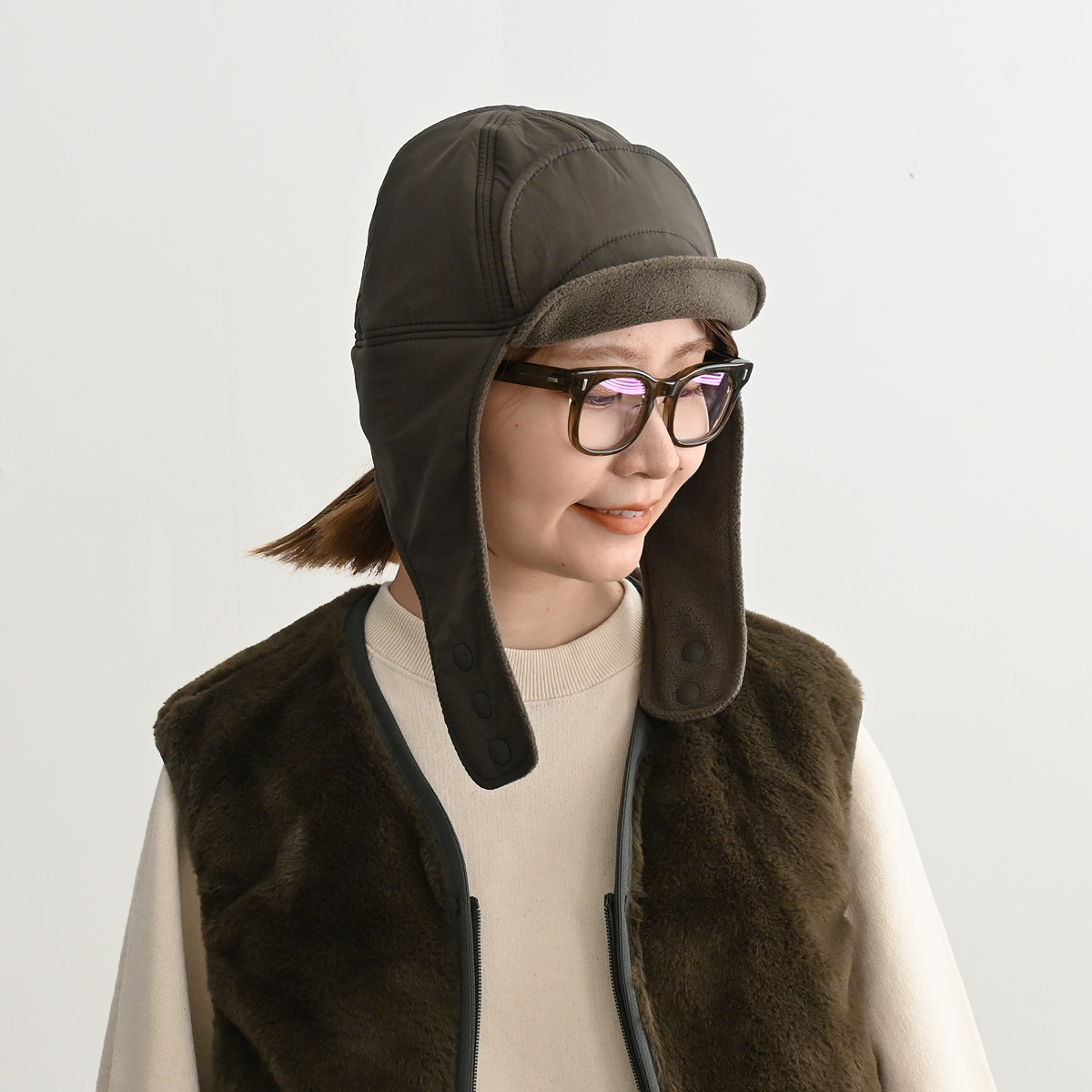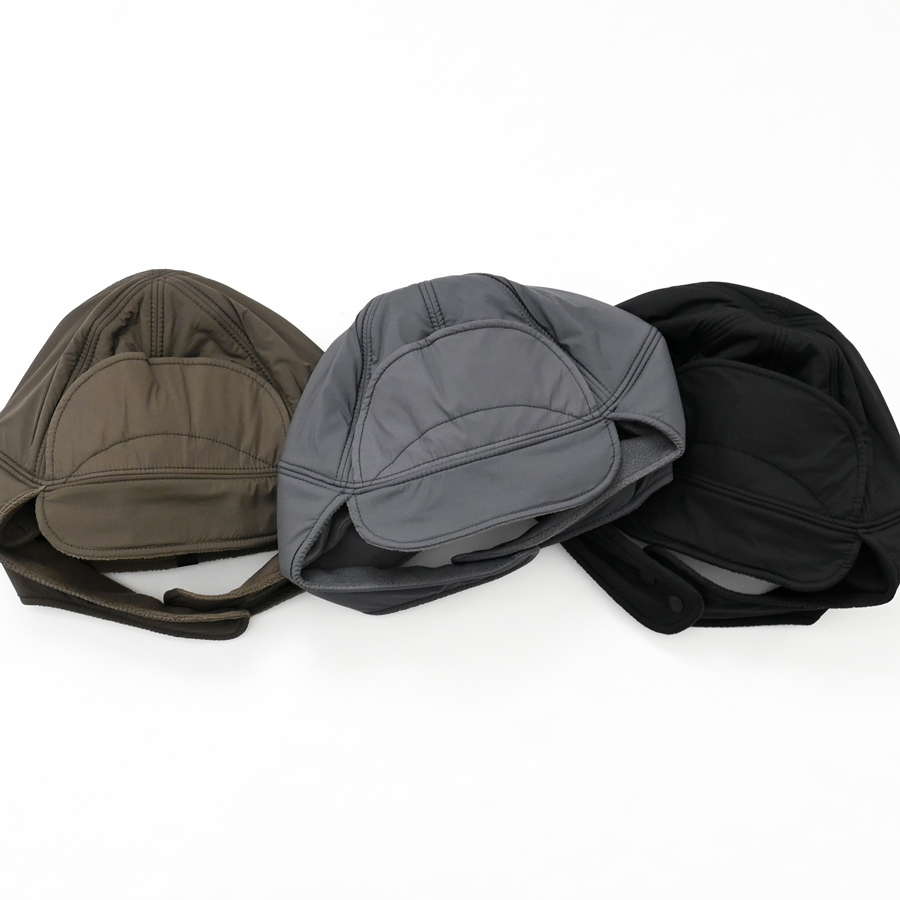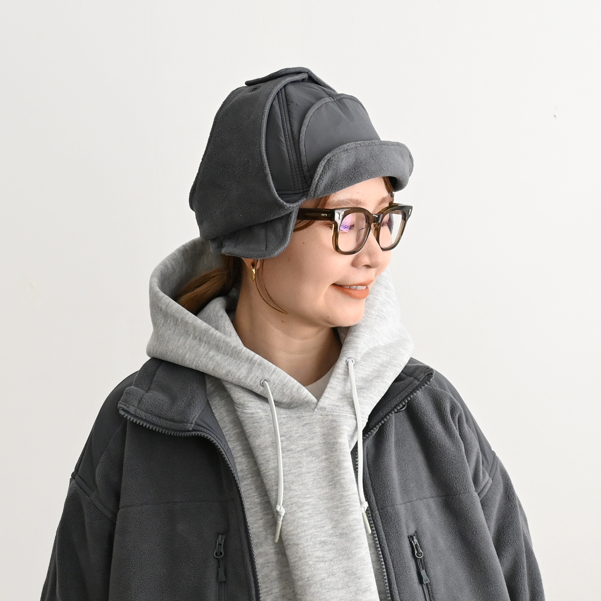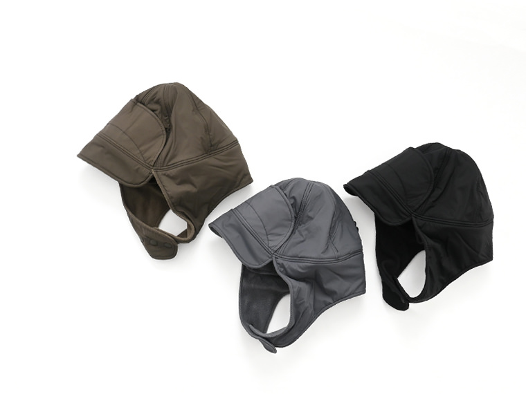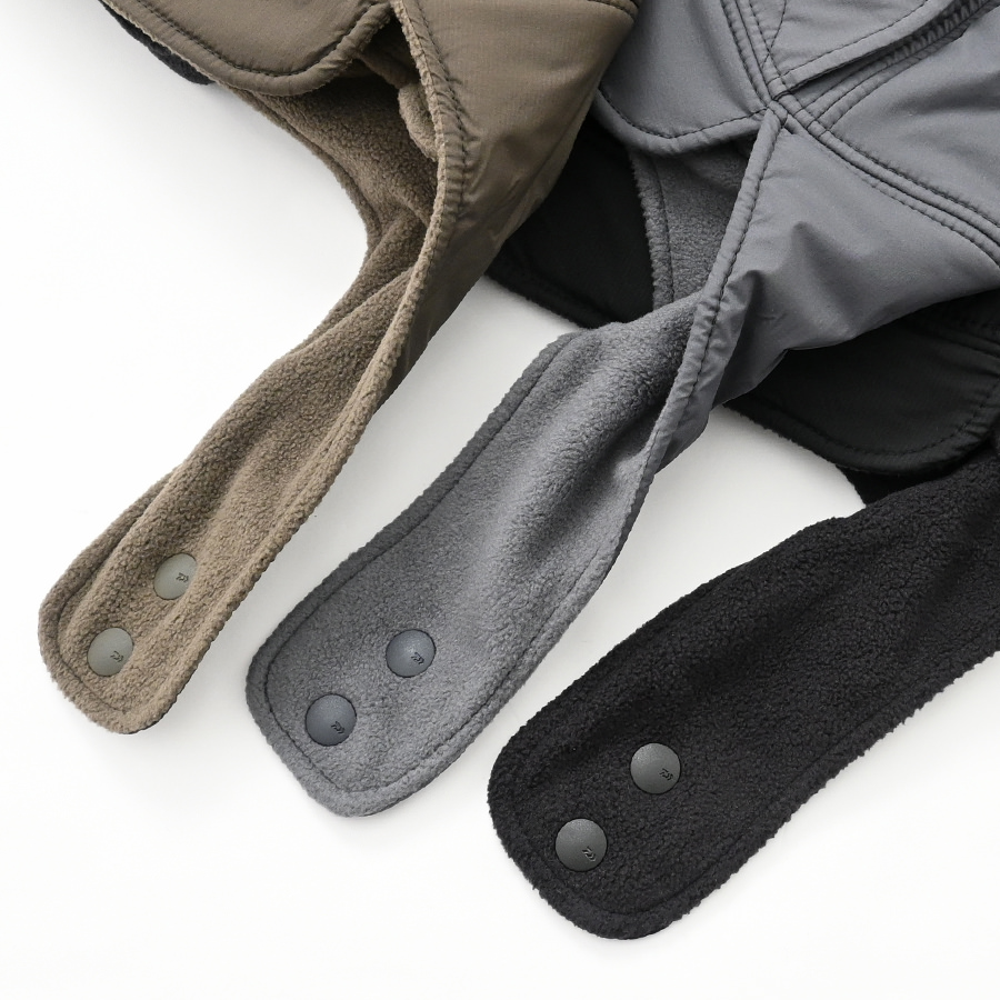 冬のアウトドアフィールドで活躍する耳当て付きフリースキャップ。