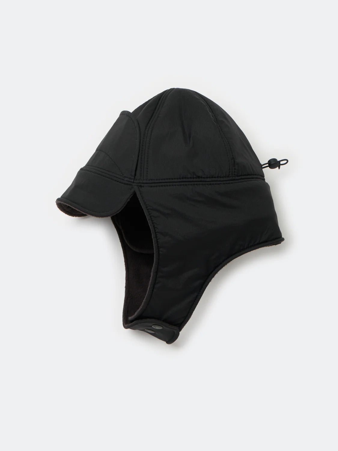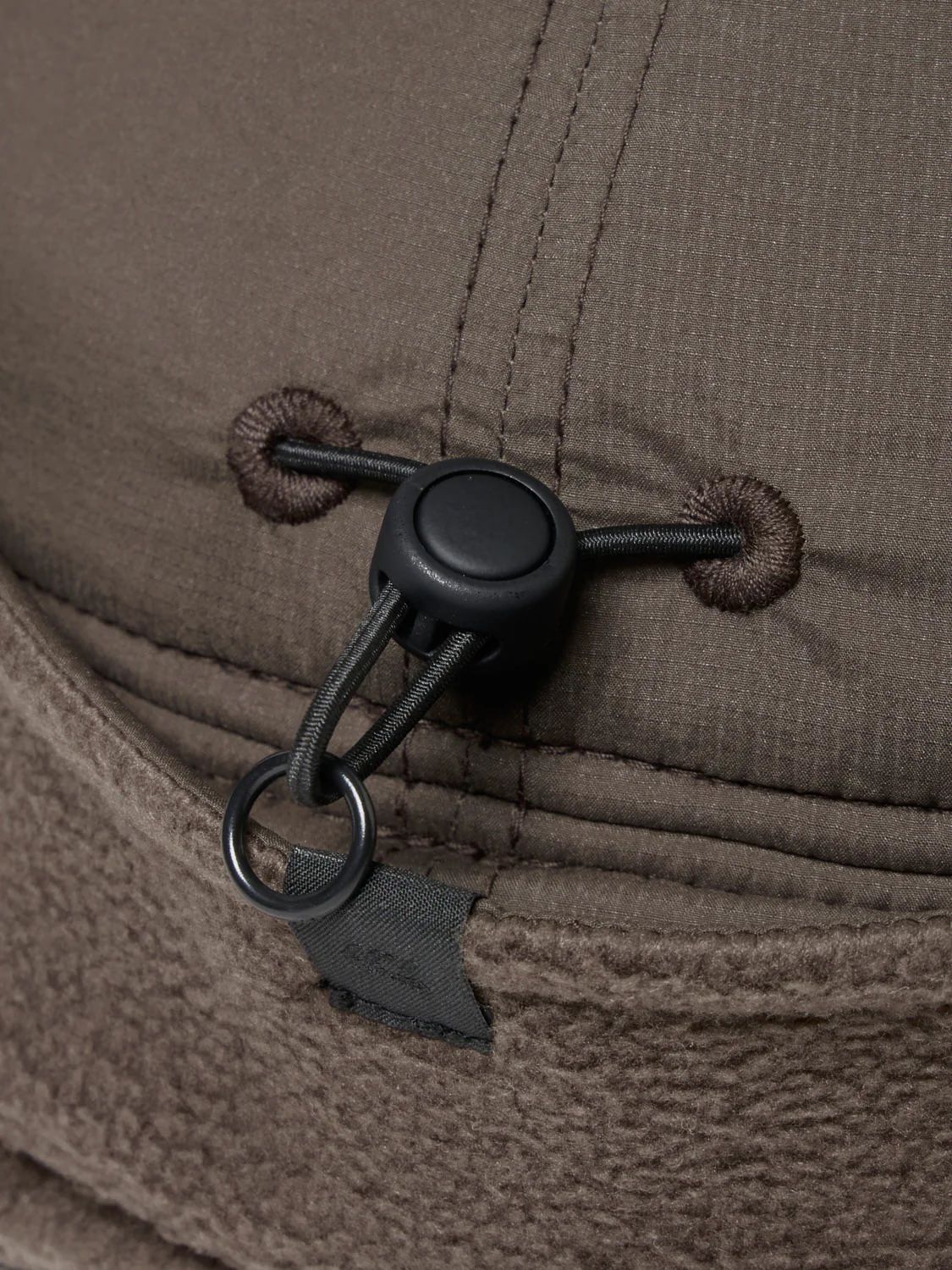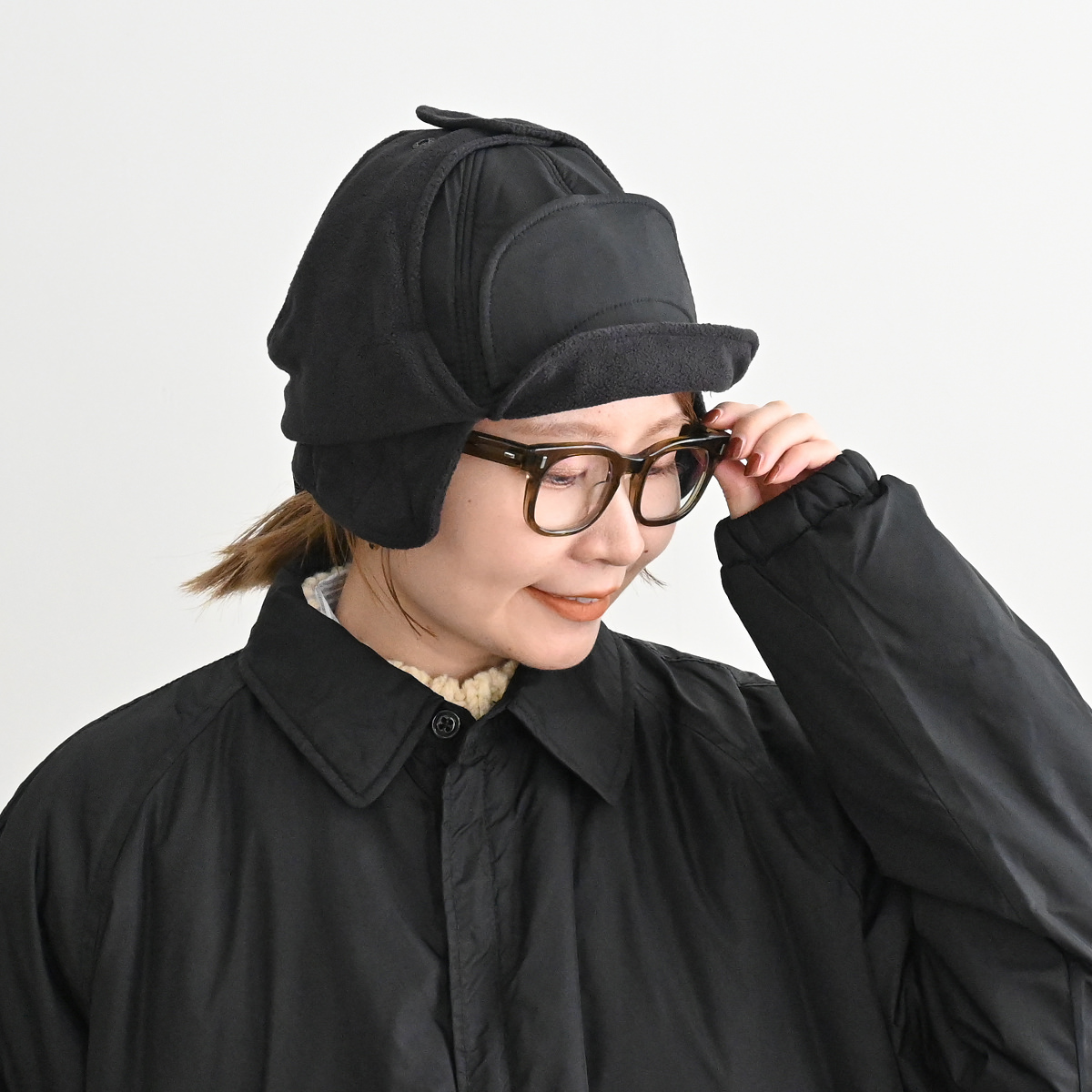 冬のアウトドアフィールドで活躍する耳当て付きフリースキャップ。