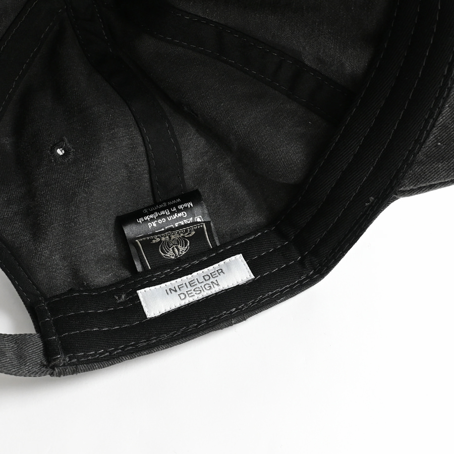 INFIELDER DESIGNらしい遊び心を効かせたエンブレムキャップ。