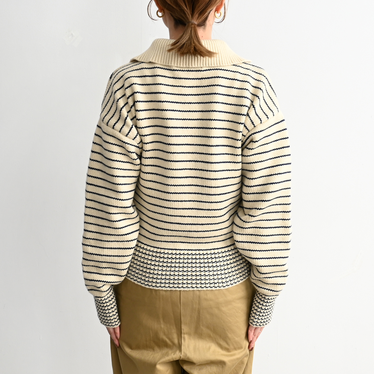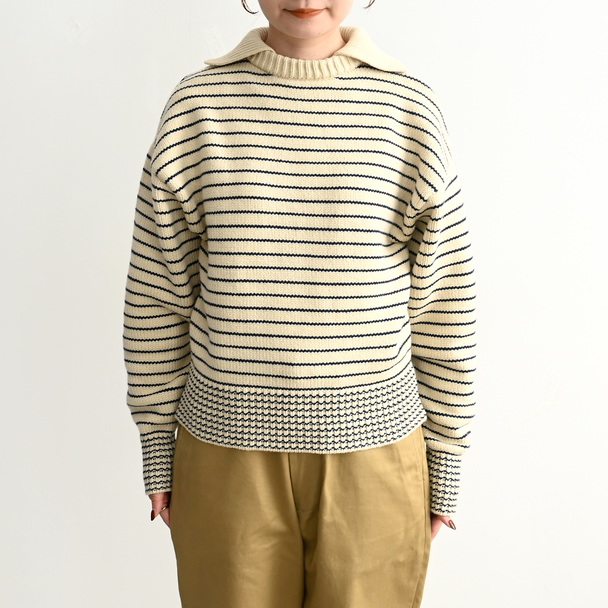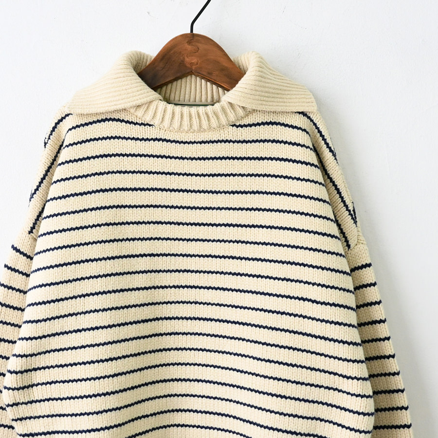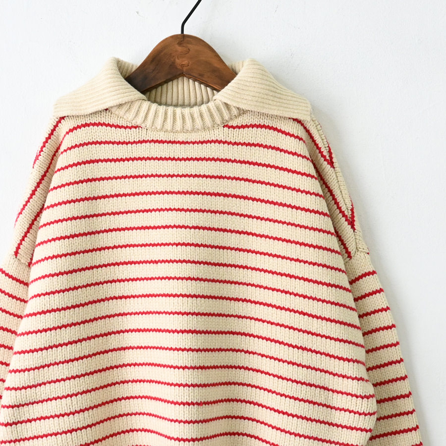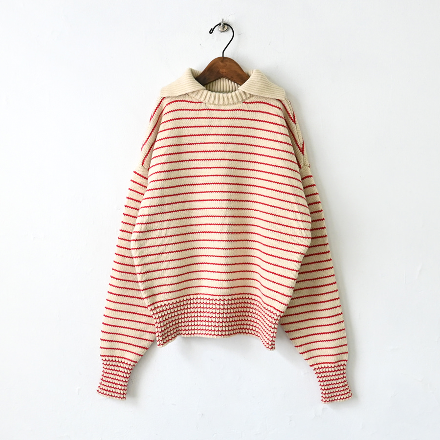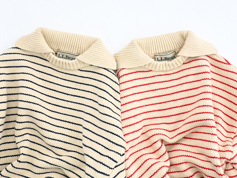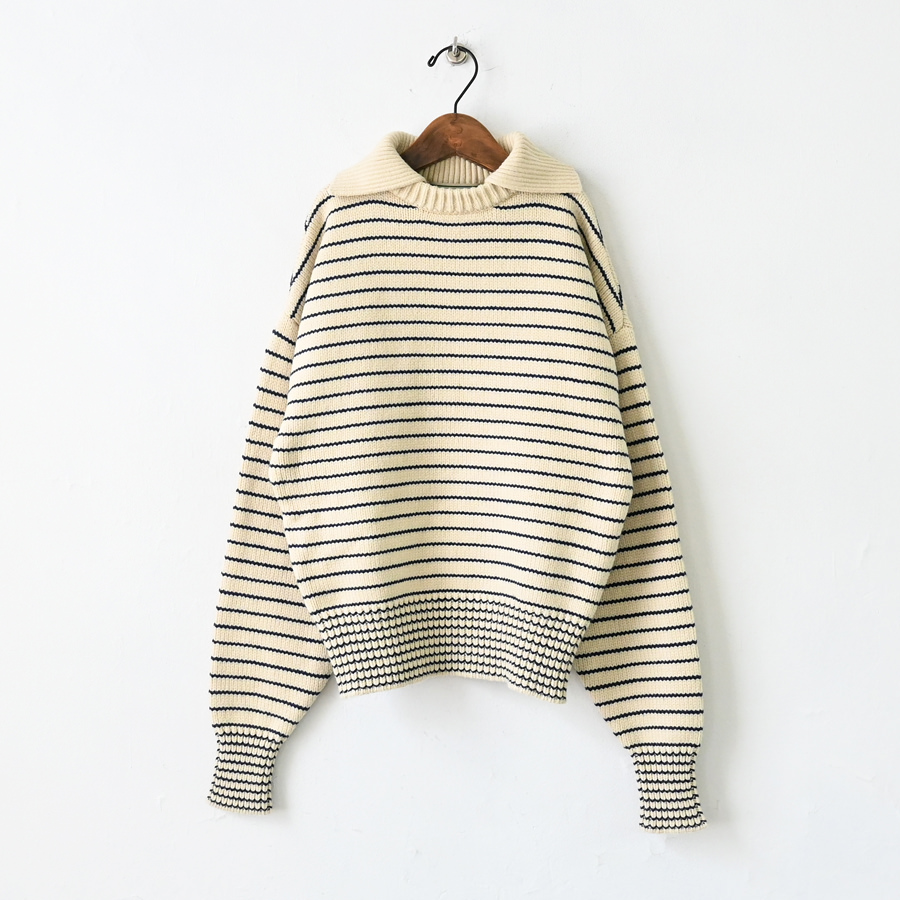 大きめの襟が特徴的な80年代のセーターをデザインベースに、軽やかなコットンとポリエステルの混紡糸でアップデート。