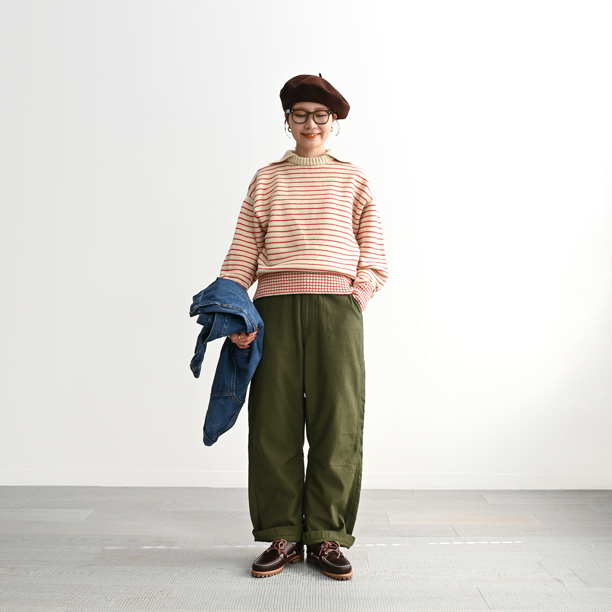 襟元の存在感がスタイリングの主役になり、シンプルなボトムスと合わせるだけで旬な雰囲気を演出します。