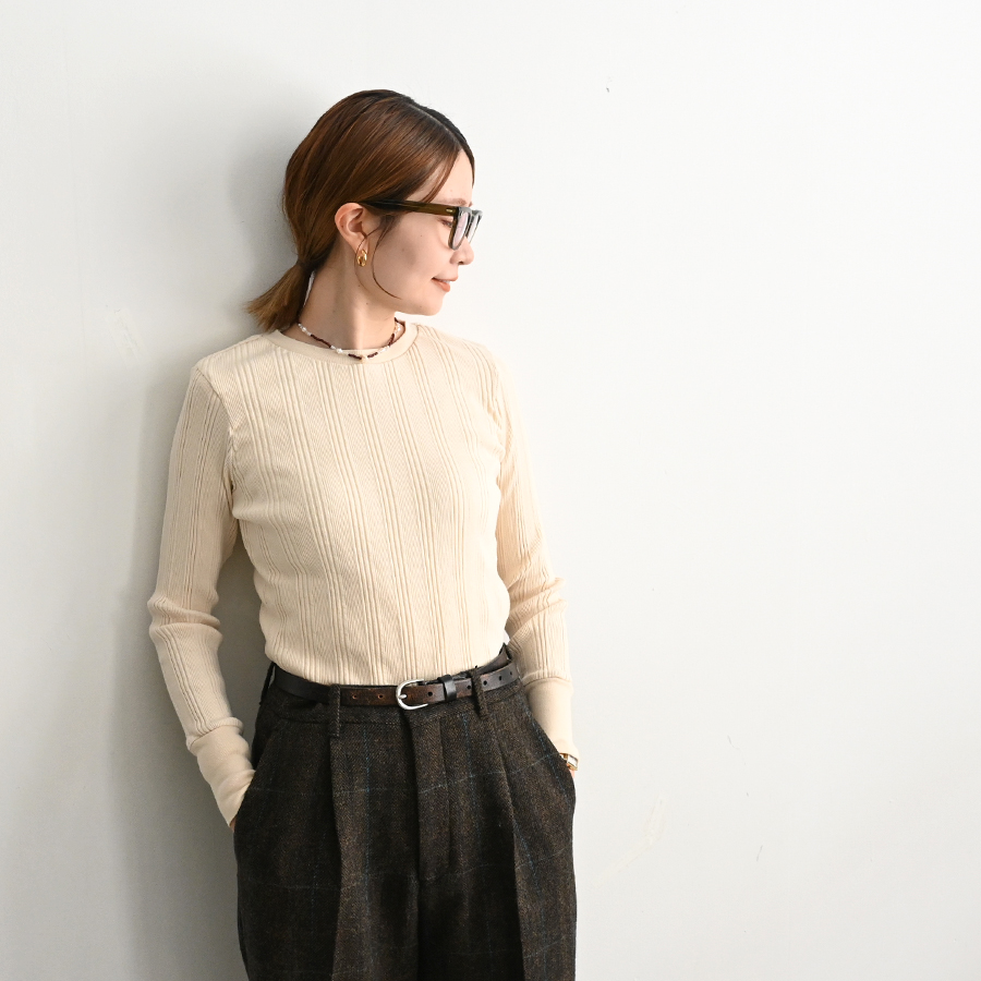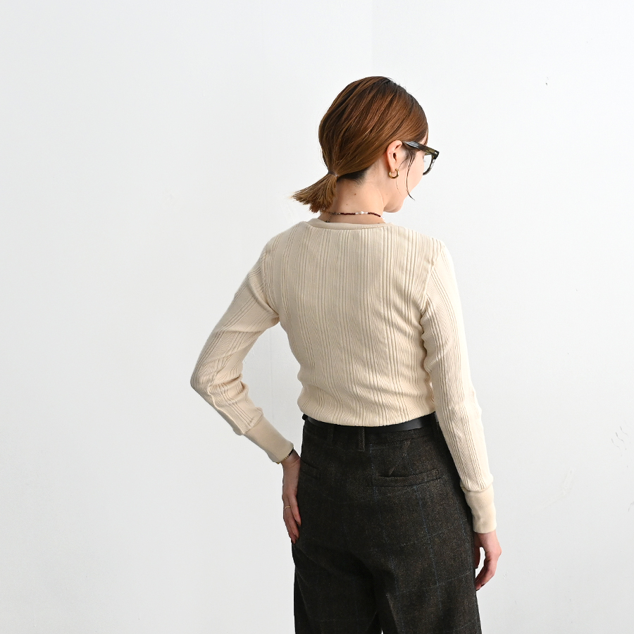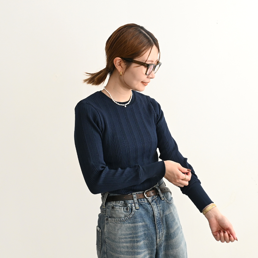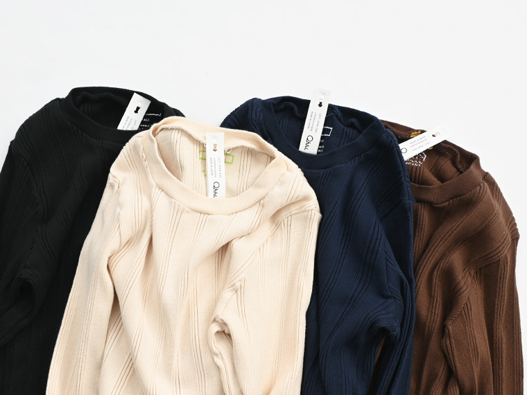 こちらは、コットンシルクのランダムリブを編み立てた、Ohh! オリジナルファブリックのロングスリーブ。