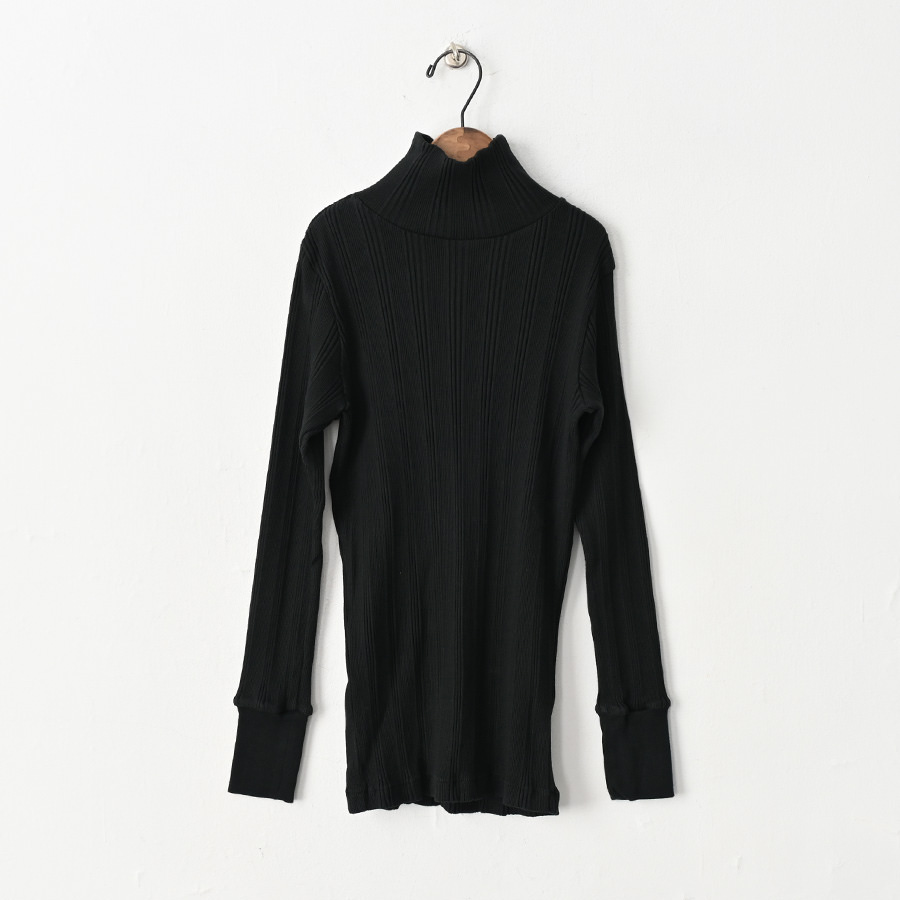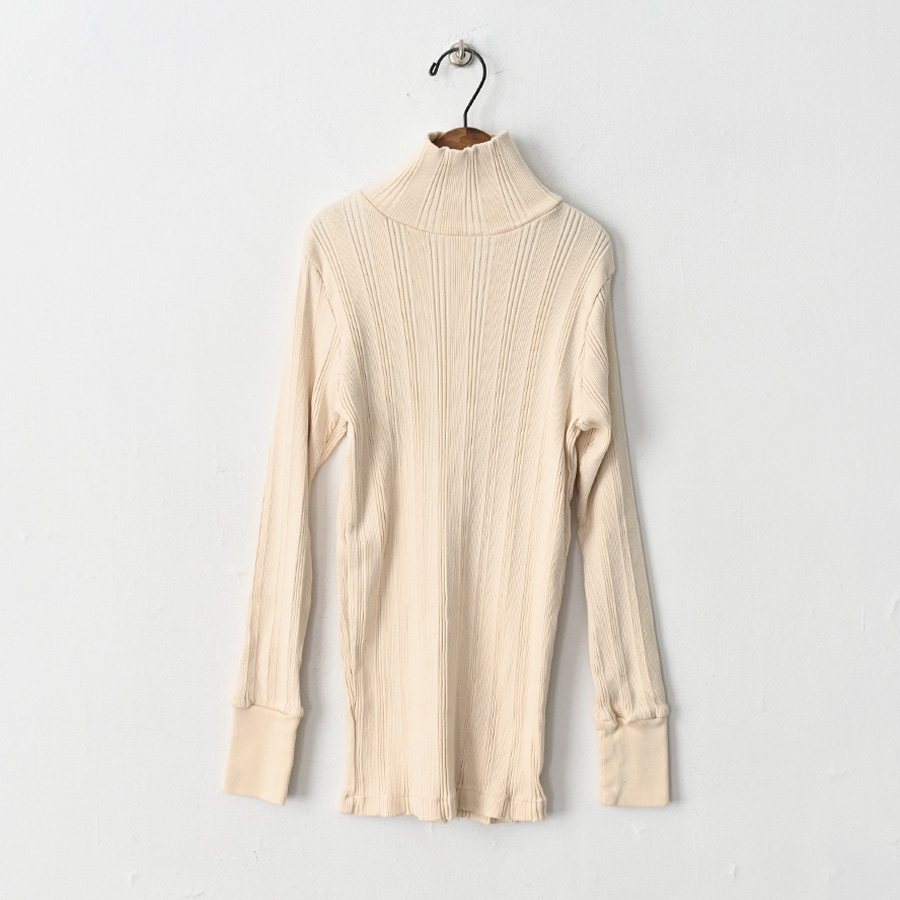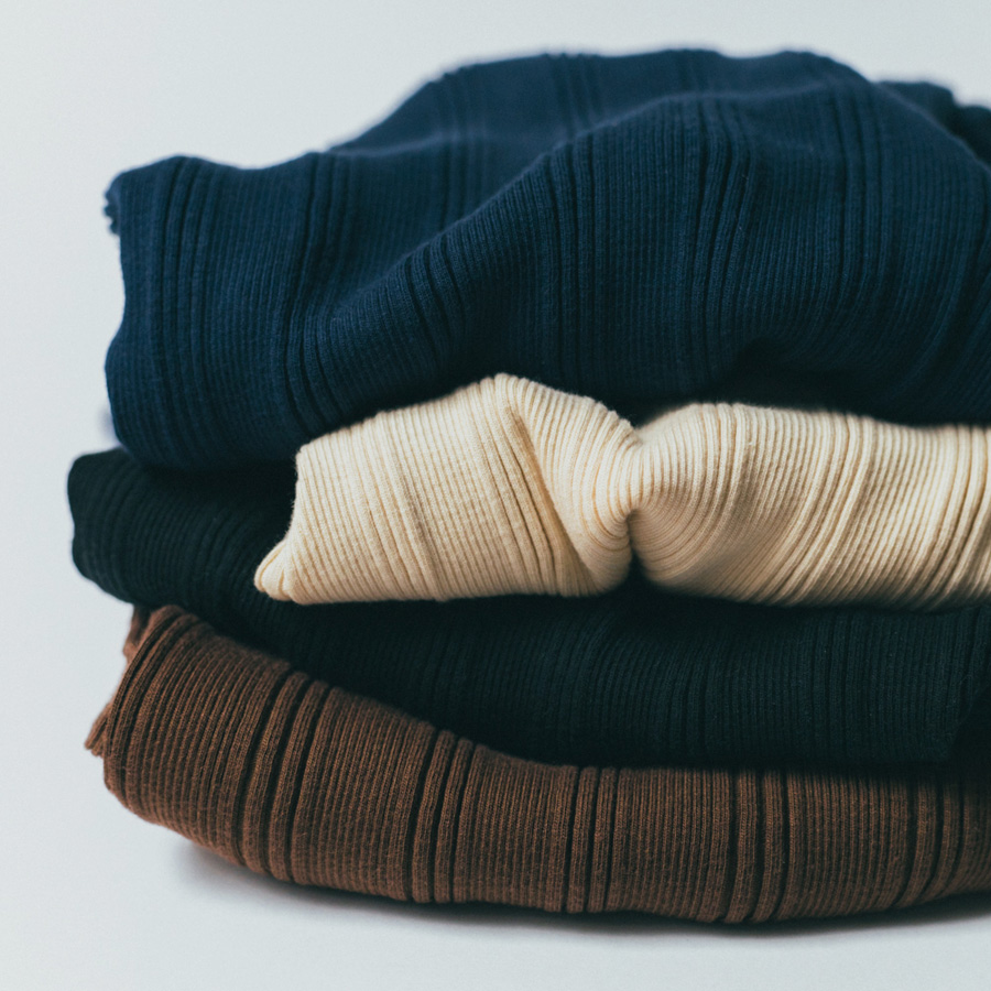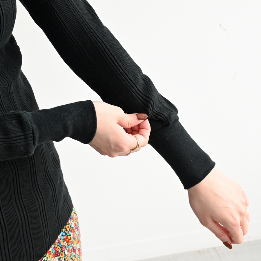 こちらは、コットンシルクのランダムリブを編み立てた、Ohh! オリジナルファブリックのタートルネックロングスリーブ。