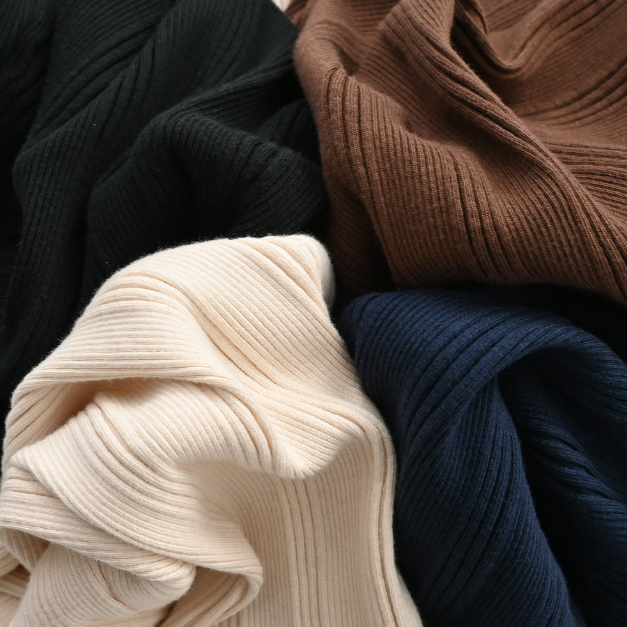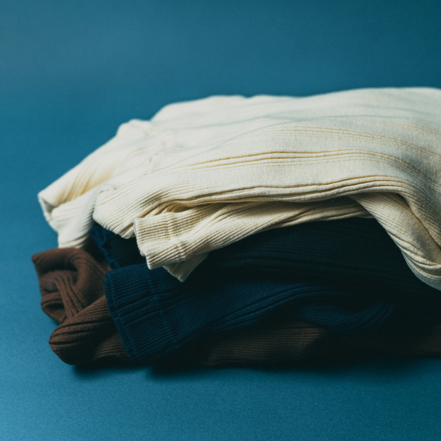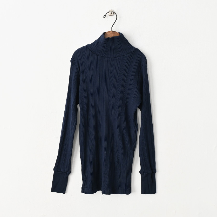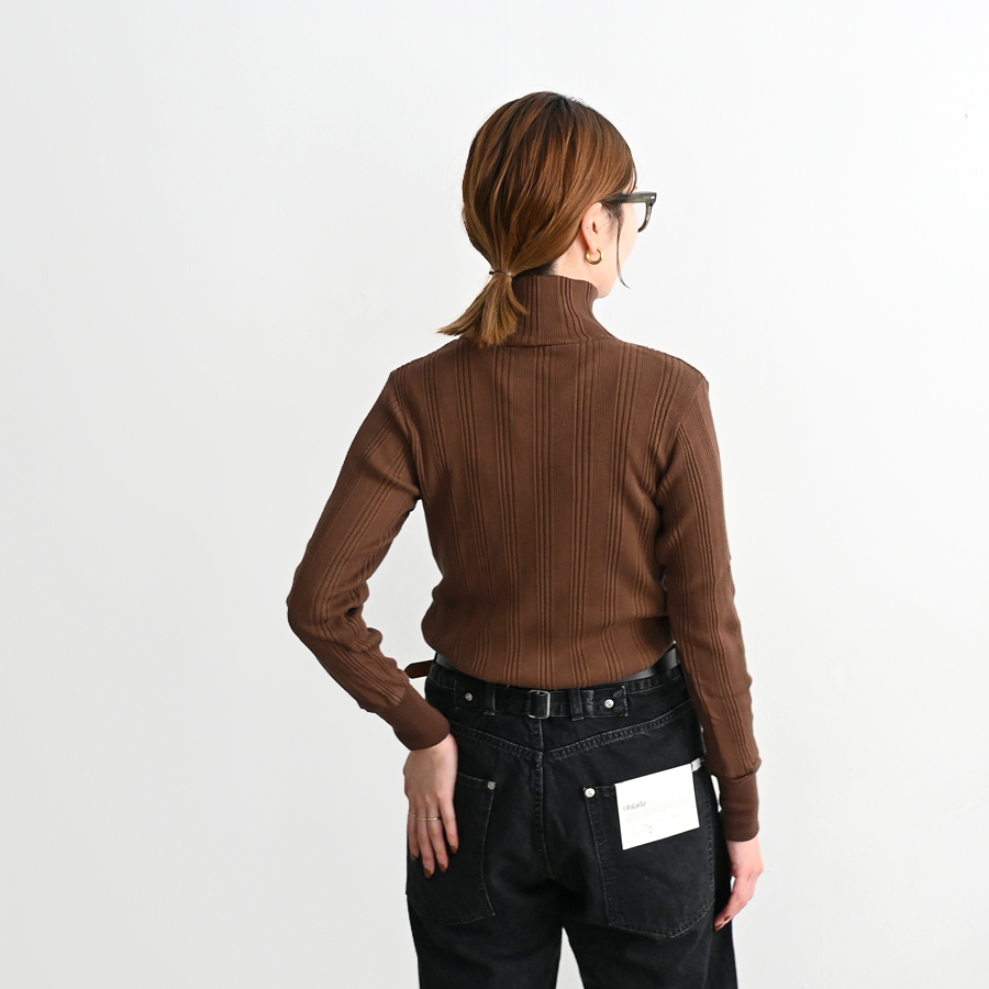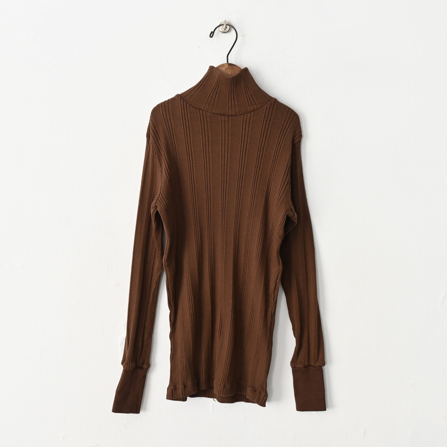 こちらは、コットンシルクのランダムリブを編み立てた、Ohh! オリジナルファブリックのタートルネックロングスリーブ。
