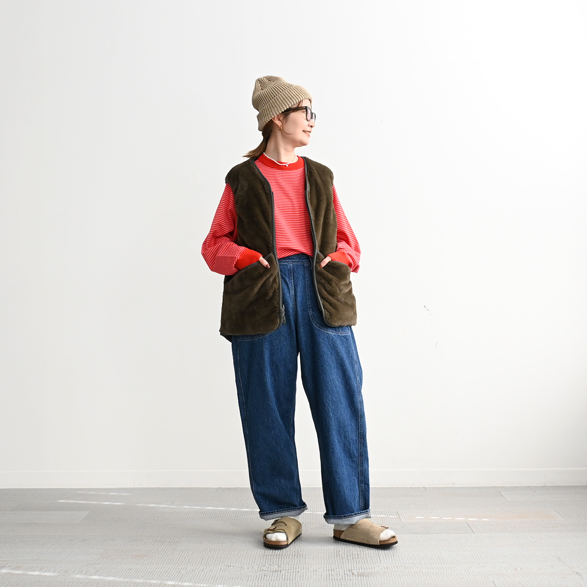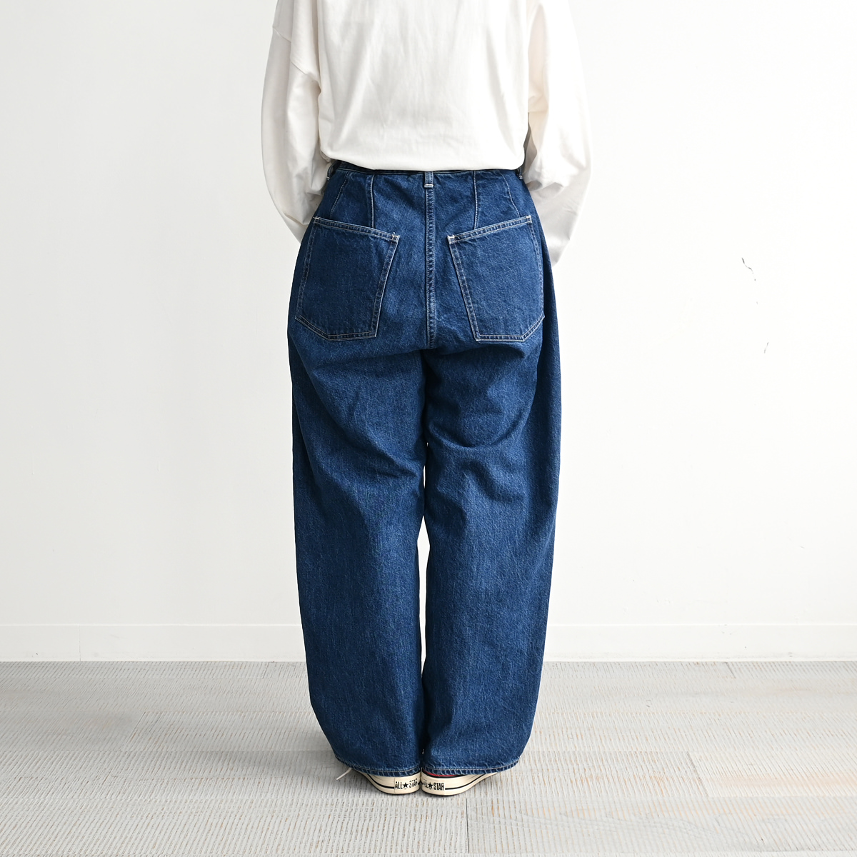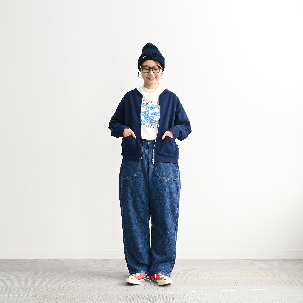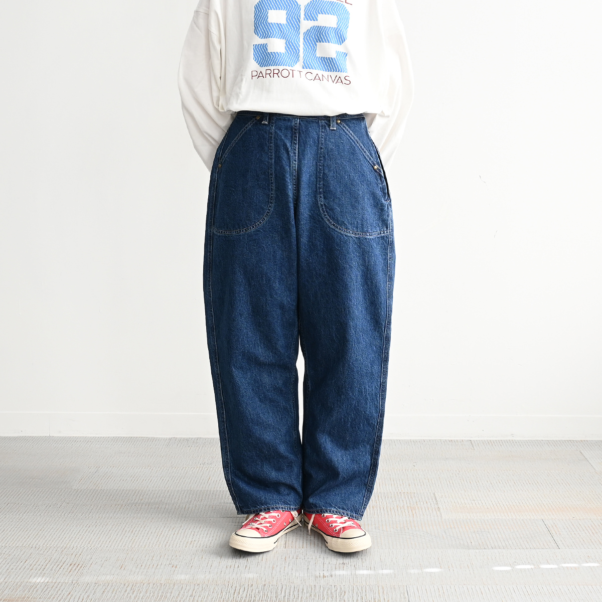 深めの股上と裾に向かって緩くテーパードのかかったシルエットが特徴で、フロント両サイドにはアウトポケット、後ろはパッチポケット付き。