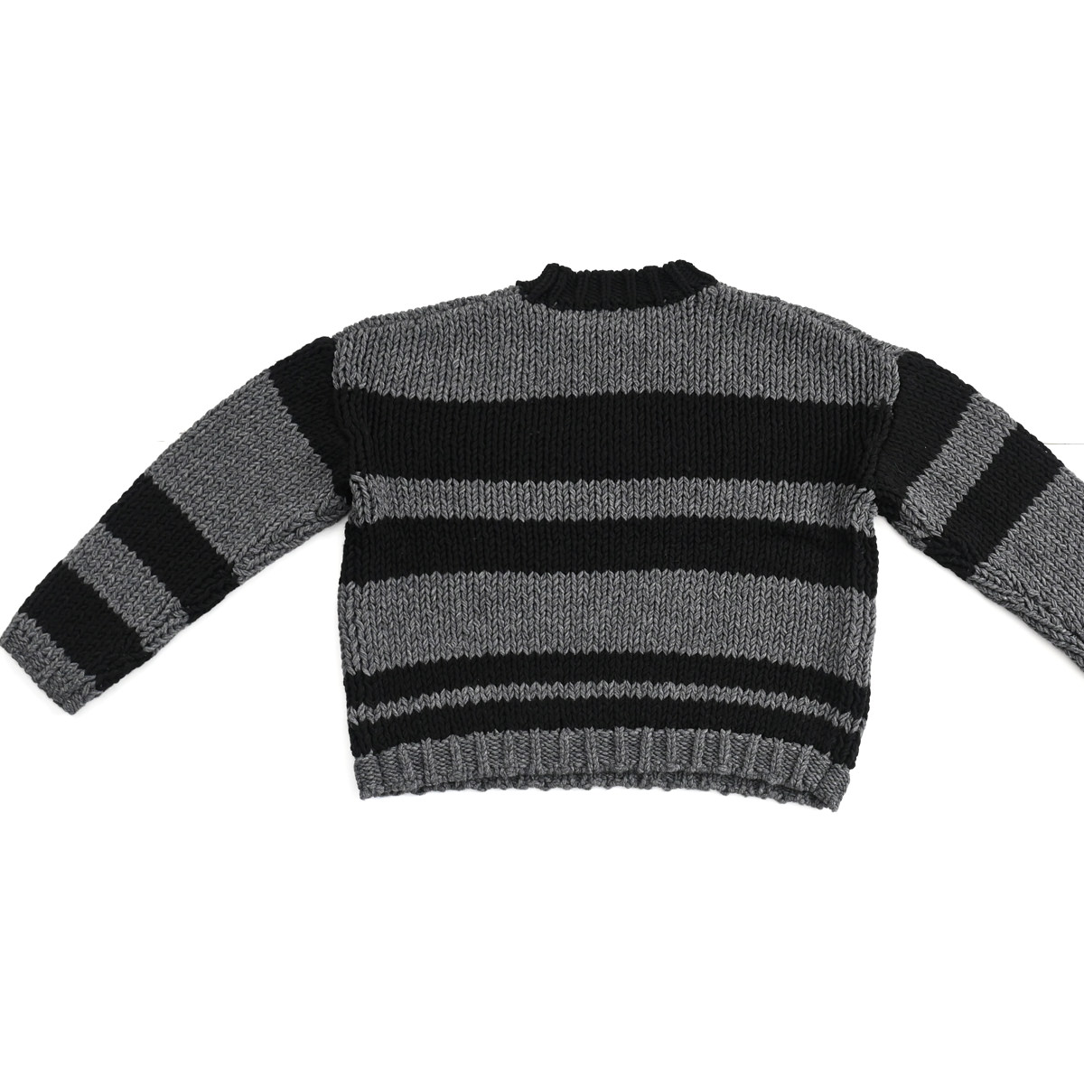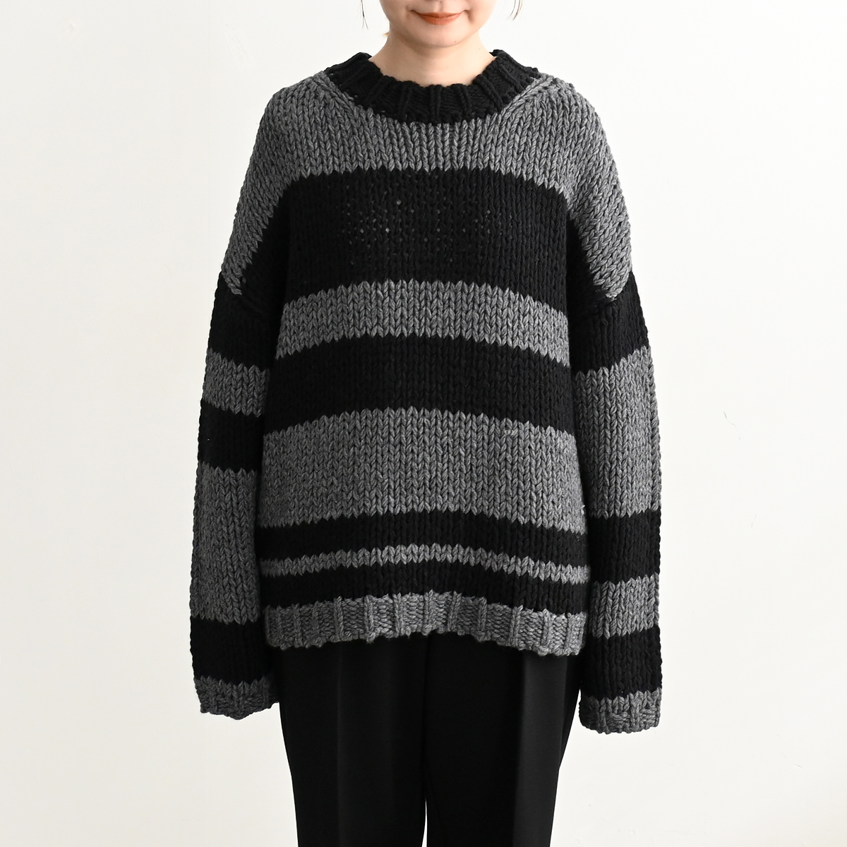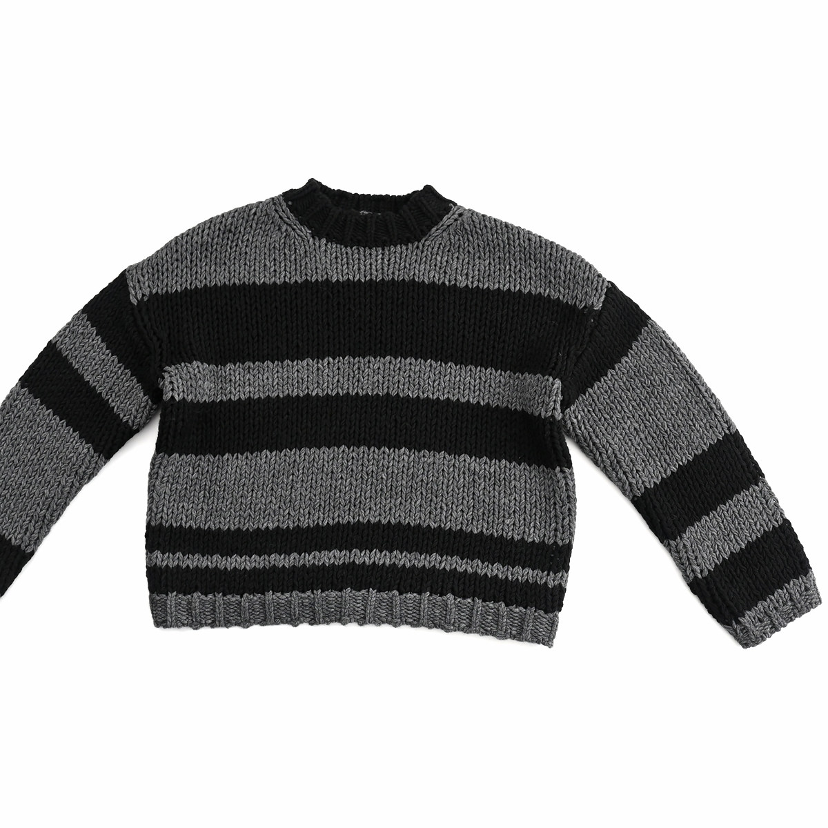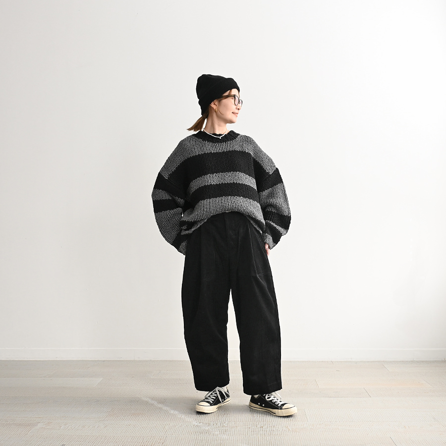 身頃・袖の太ボーダーは左右ピッチが違うランダムボーダー。