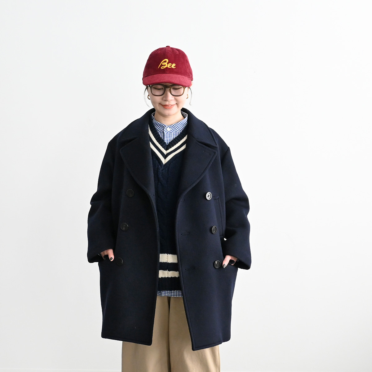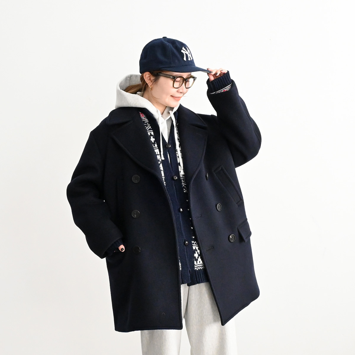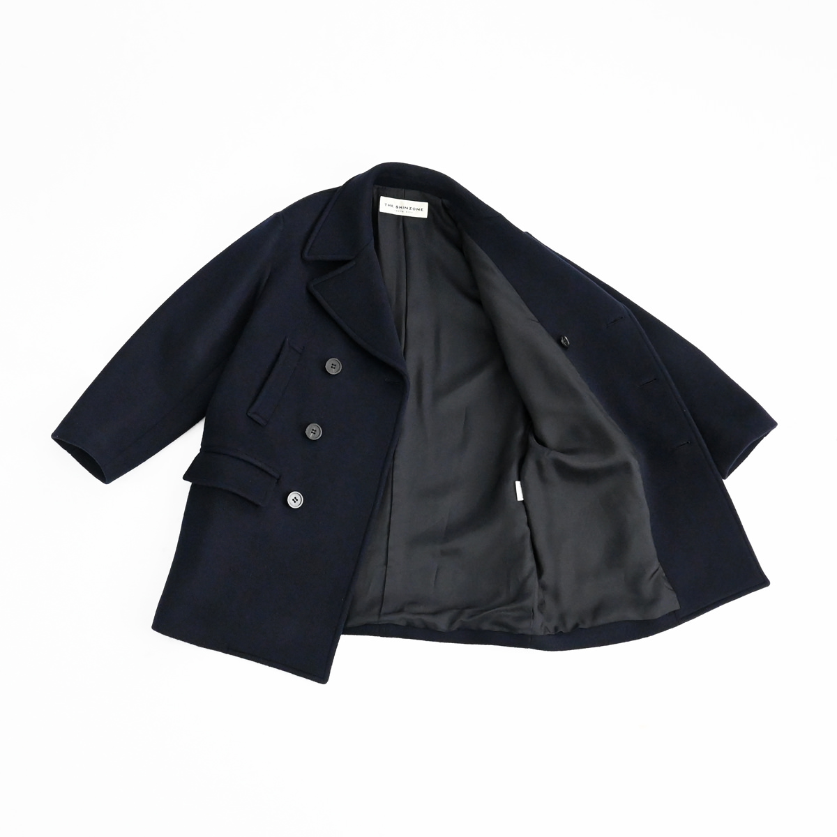 襟を大きく、さらにオーバーサイズにすることでクラシックなデザインのコートを新鮮な印象に仕上げました。