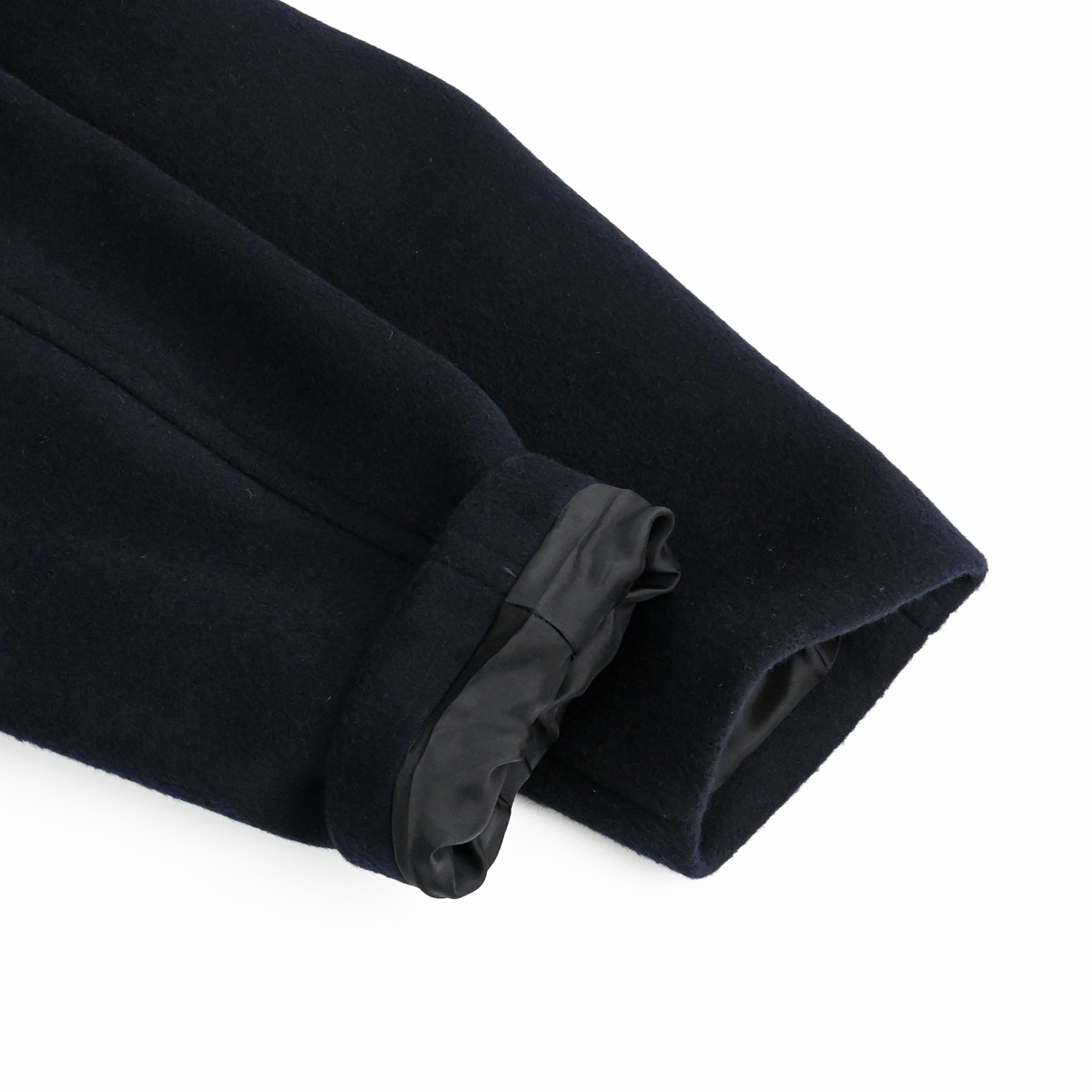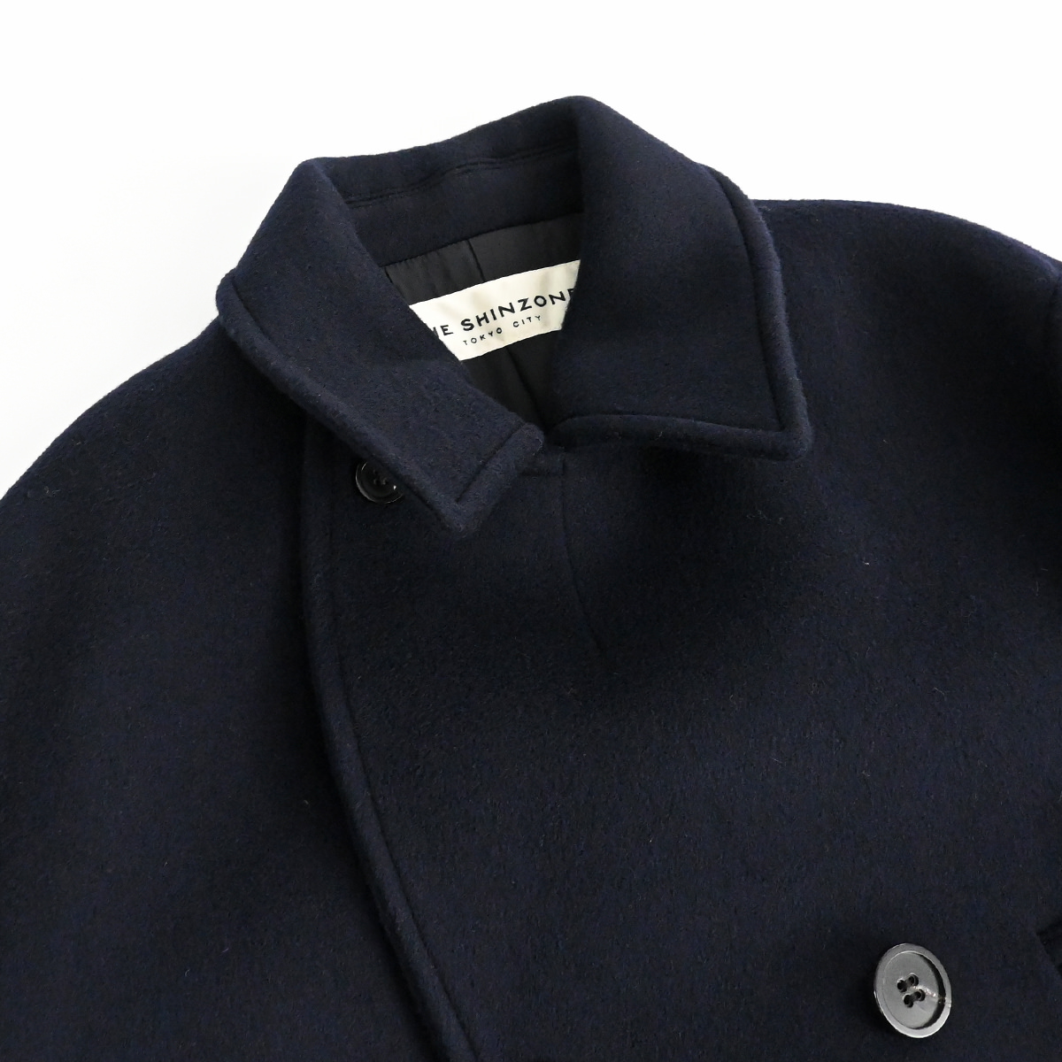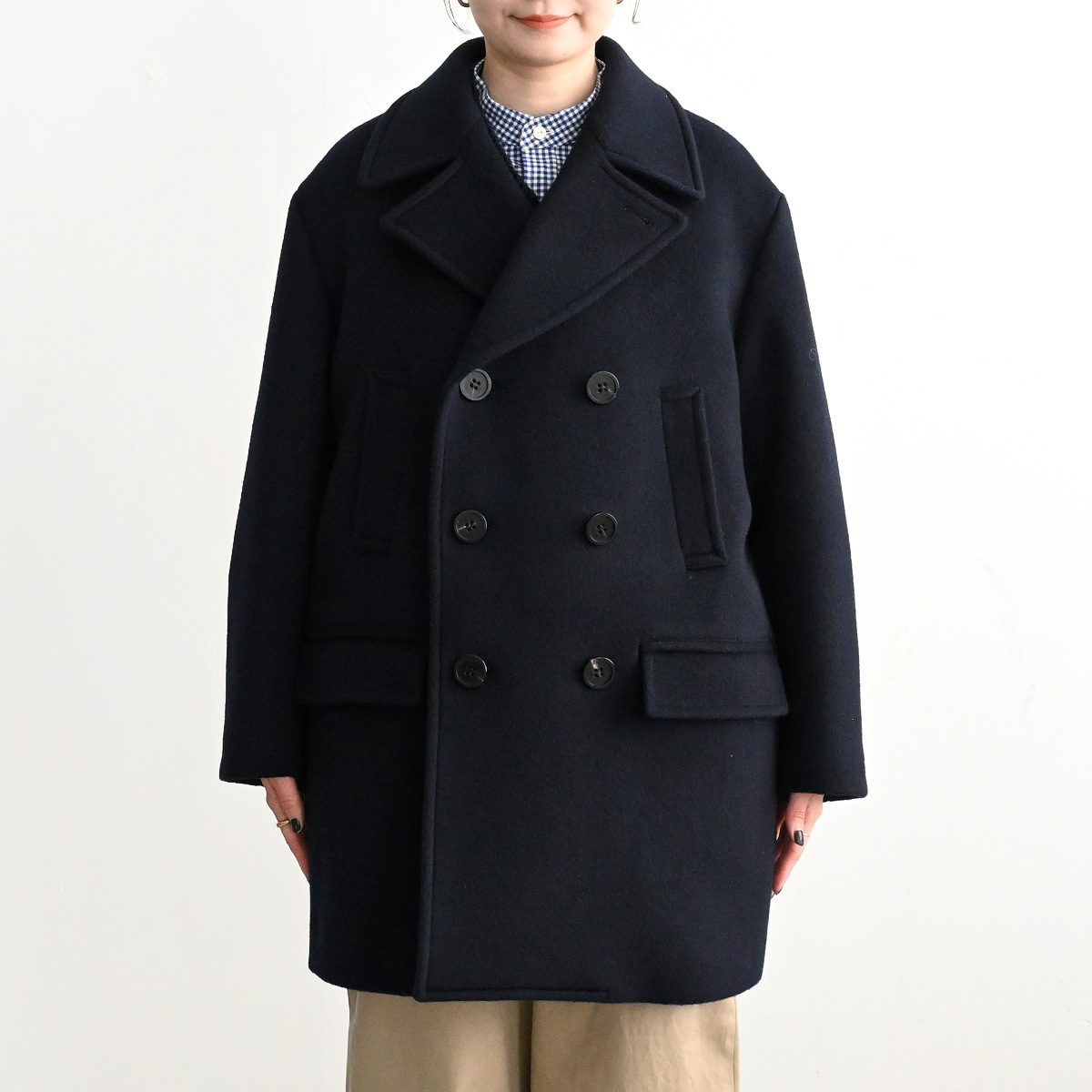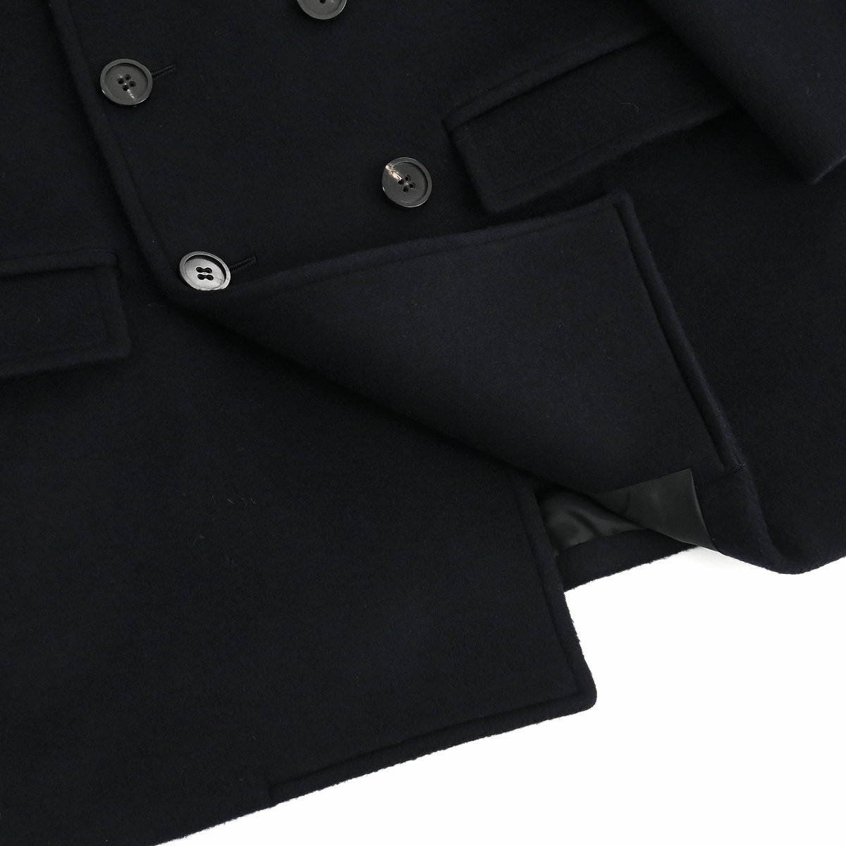 太番手である14番手のラムウールスーパー糸を織り上げた艶とハリ感が特徴のビーバー生地を使用したピーコートです。