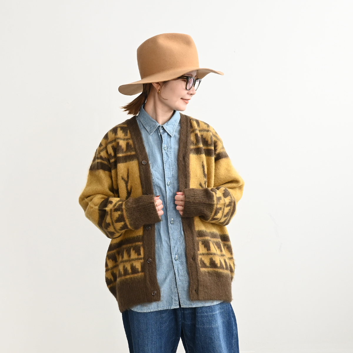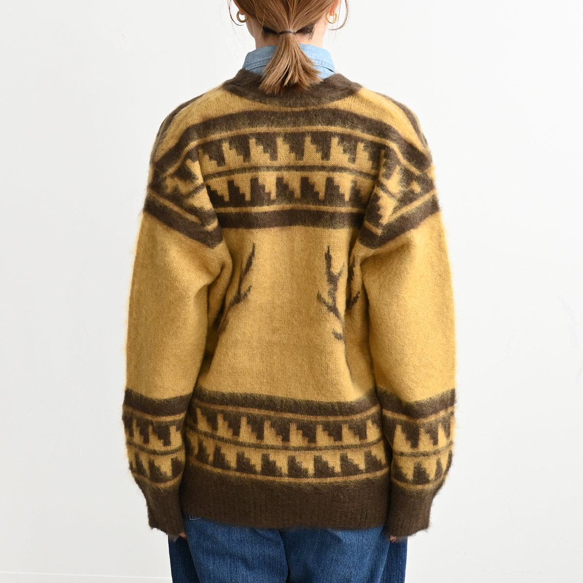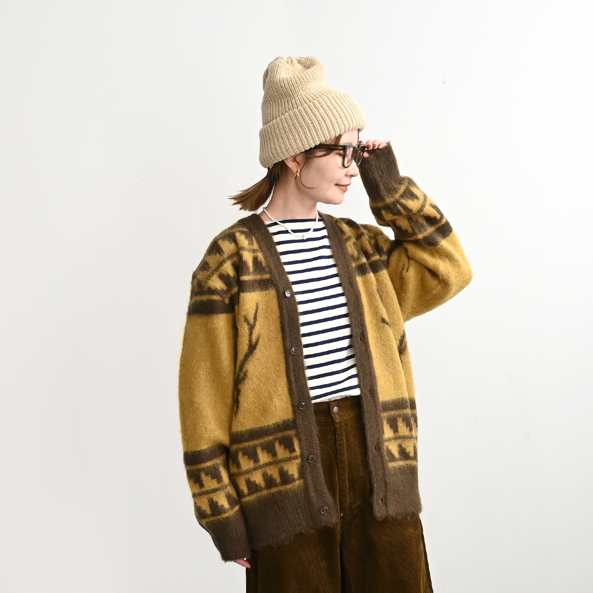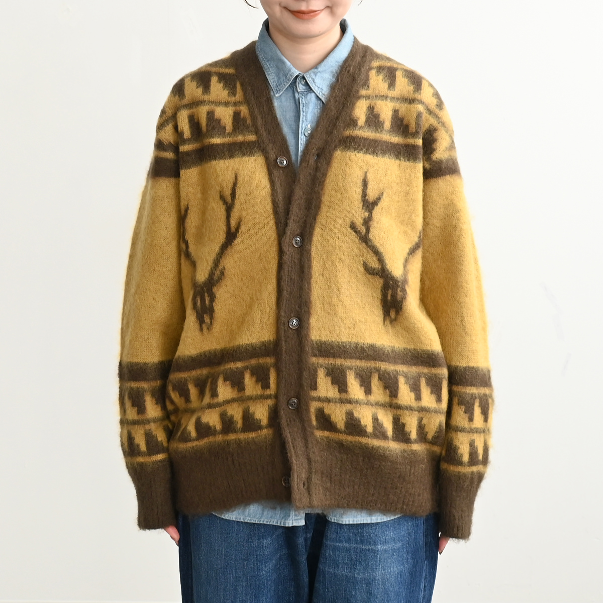 発色の良いモヘアで制作された、個性的なVネックカーディガンです。