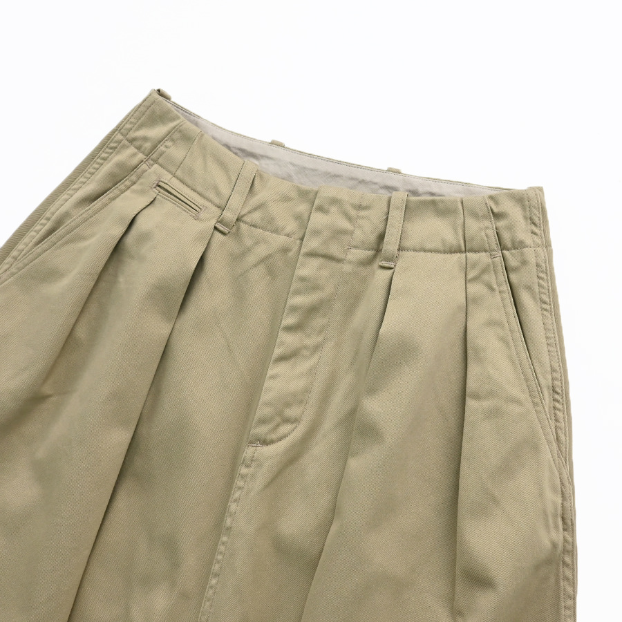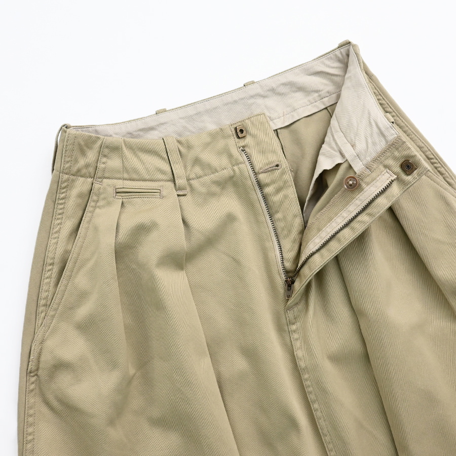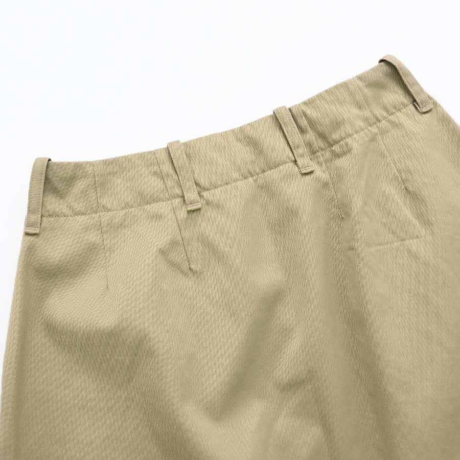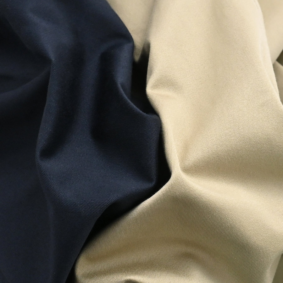 リサイクルポリエステルの外側をオーガニックコットンで覆った二層構造のカバーリングコアヤーンを使用し、クラシックなチノ素材を製作。