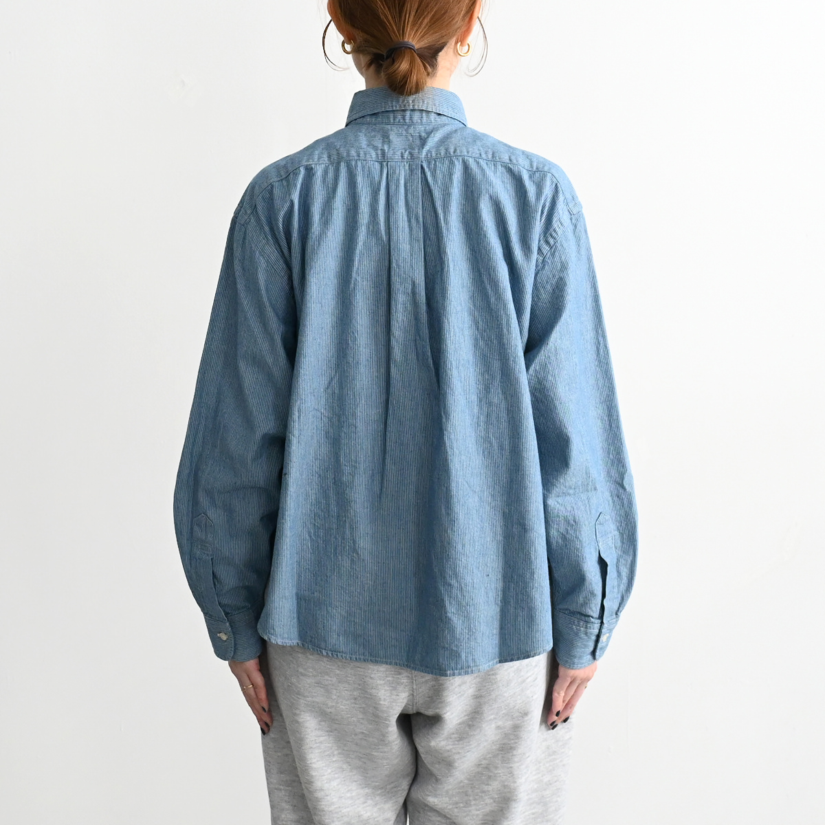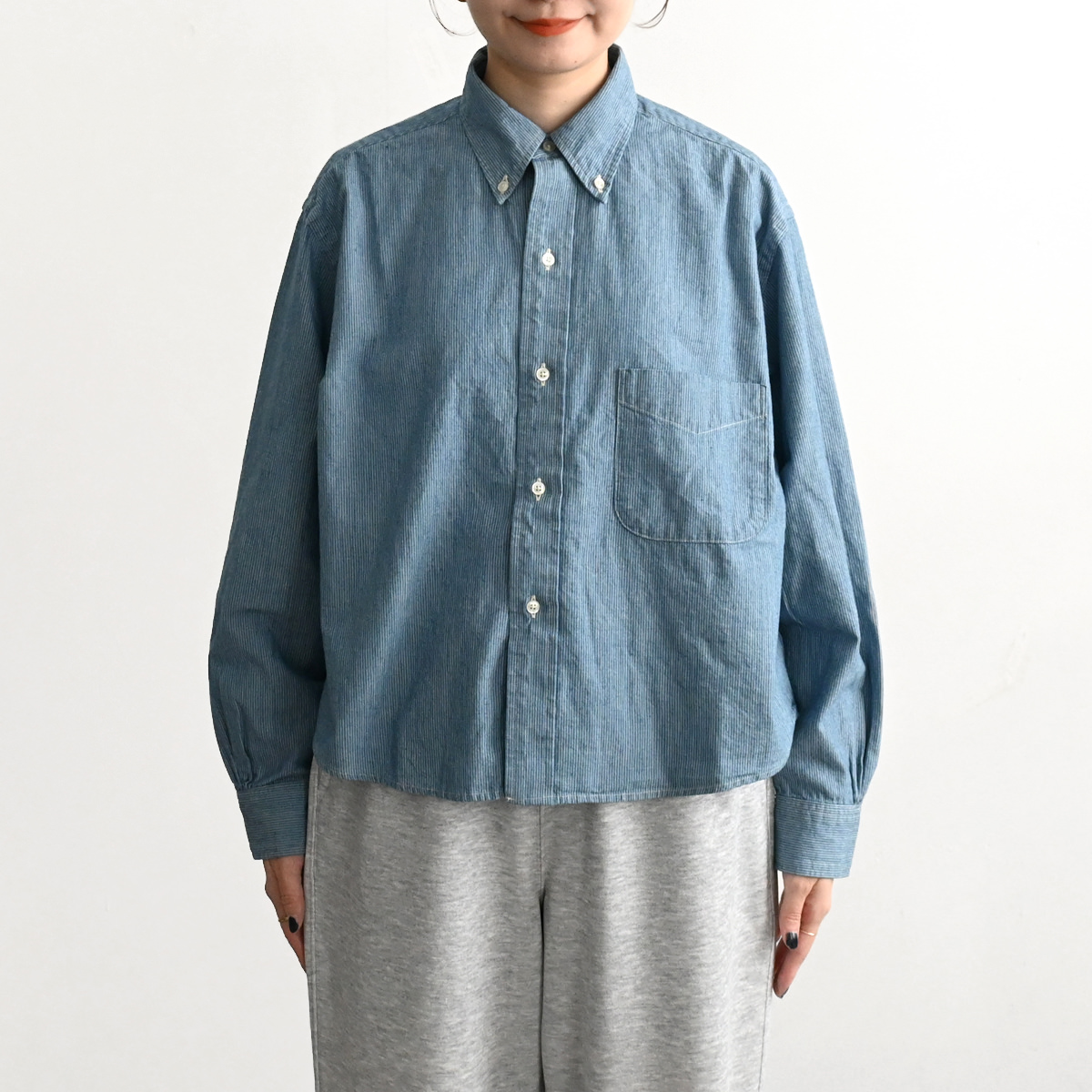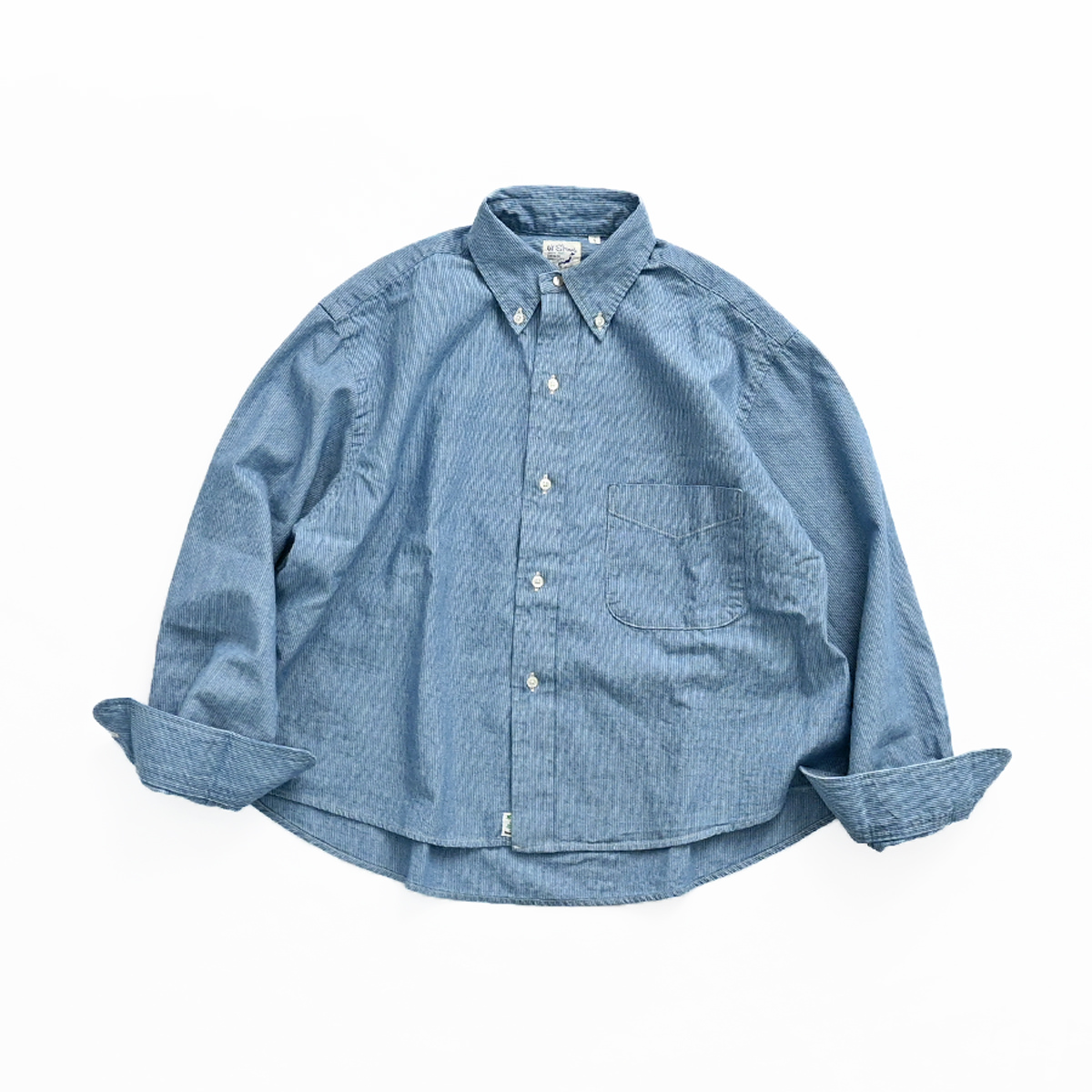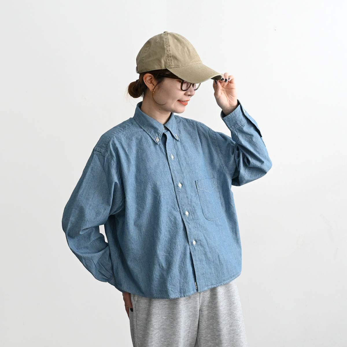 コットン100%のヒッコリー生地を使用したショート丈の長袖ボタンダウンシャツ。