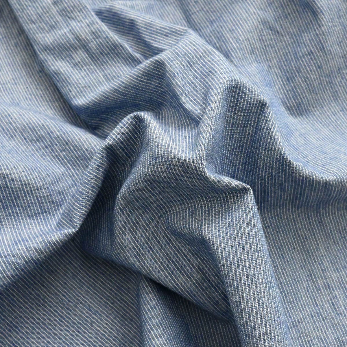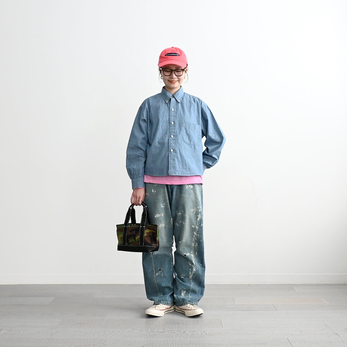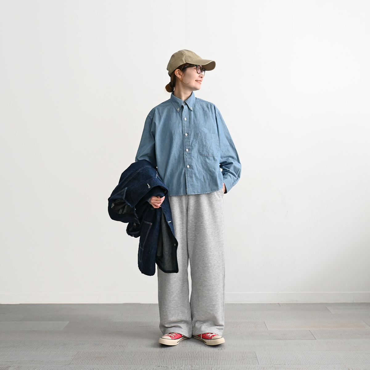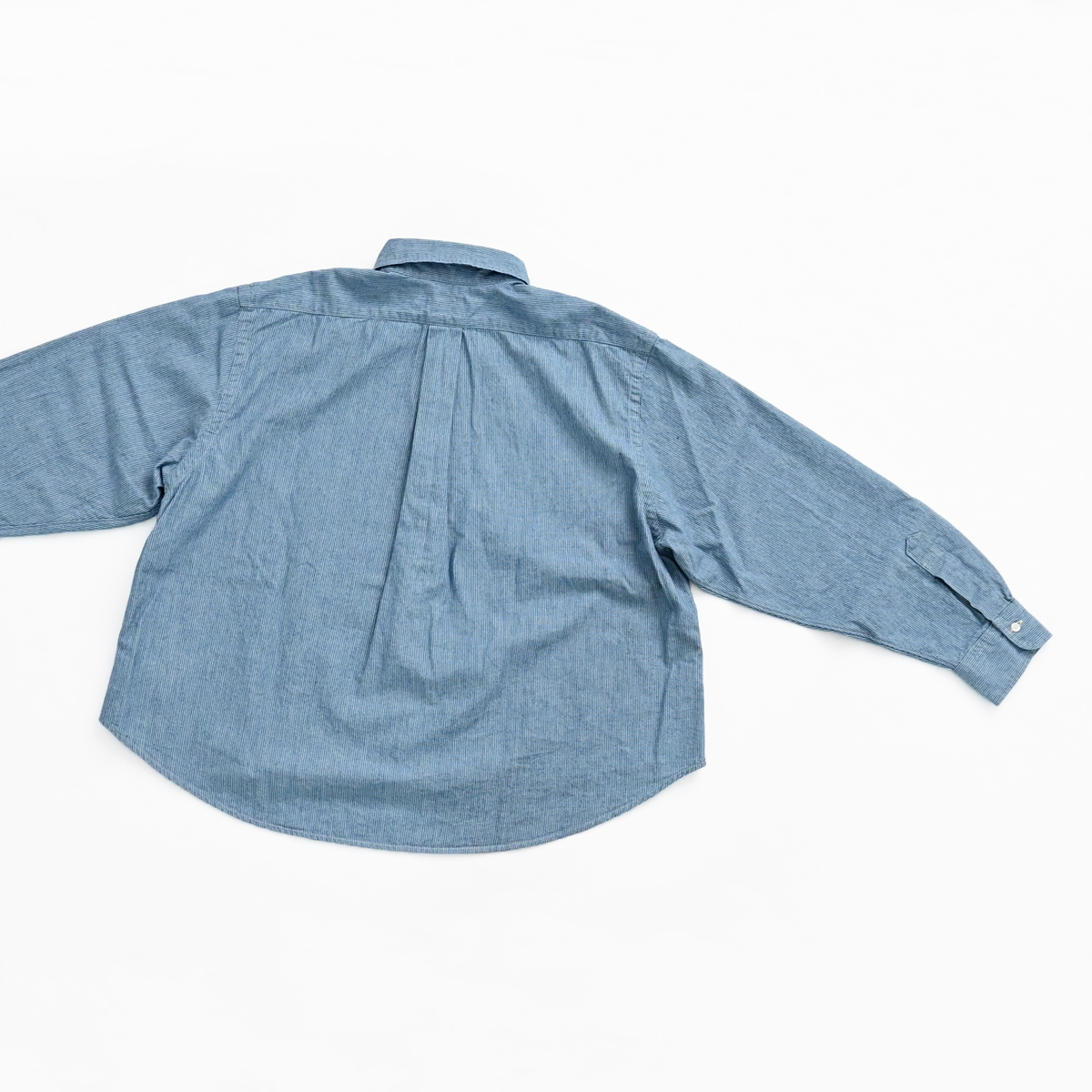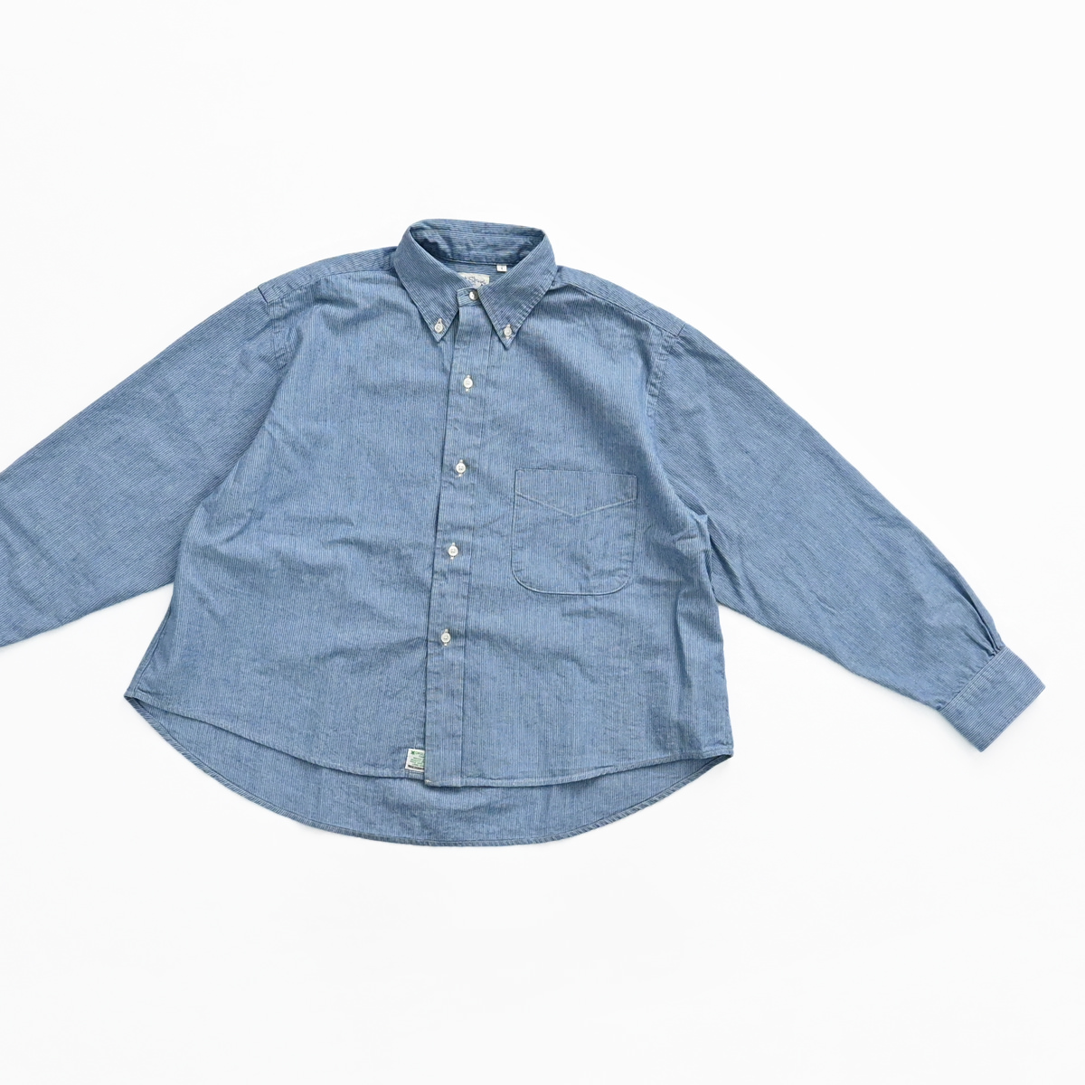 コットン100%のヒッコリー生地を使用したショート丈の長袖ボタンダウンシャツ。